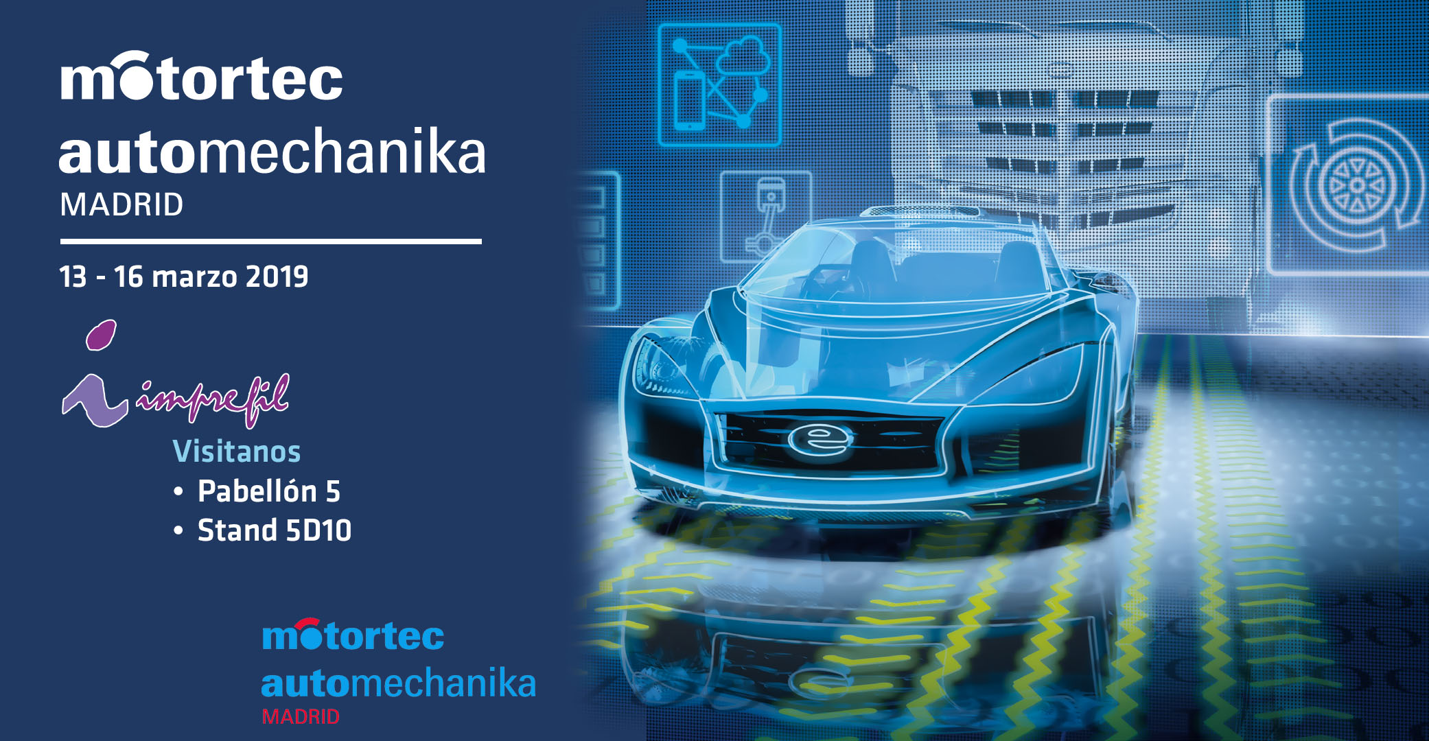 Imprefil anuncia su participación en la prestigiosa feria Motortec Automechanika 2019, feria internacional líder del sector de la automoción, que se celebrará en Madrid del 13 al 16 de marzo en IFEMA. Imprefil sigue fiel a su cita y como ha venido haciendo desde la primera edición de la feria invita a todos sus colaboradores y empresas del sector interesadas en conocer sus novedades a visitarles en el stand 5D10 situado en el pabellón 5.